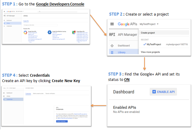 The package plusser[4] provides an API interface to Google+. It provides functions to retrieve posts, profiles and pages. You will need first to create an API Key on Google Developers Console. We provide in the figure below the steps to perform before using Google+ API in R.